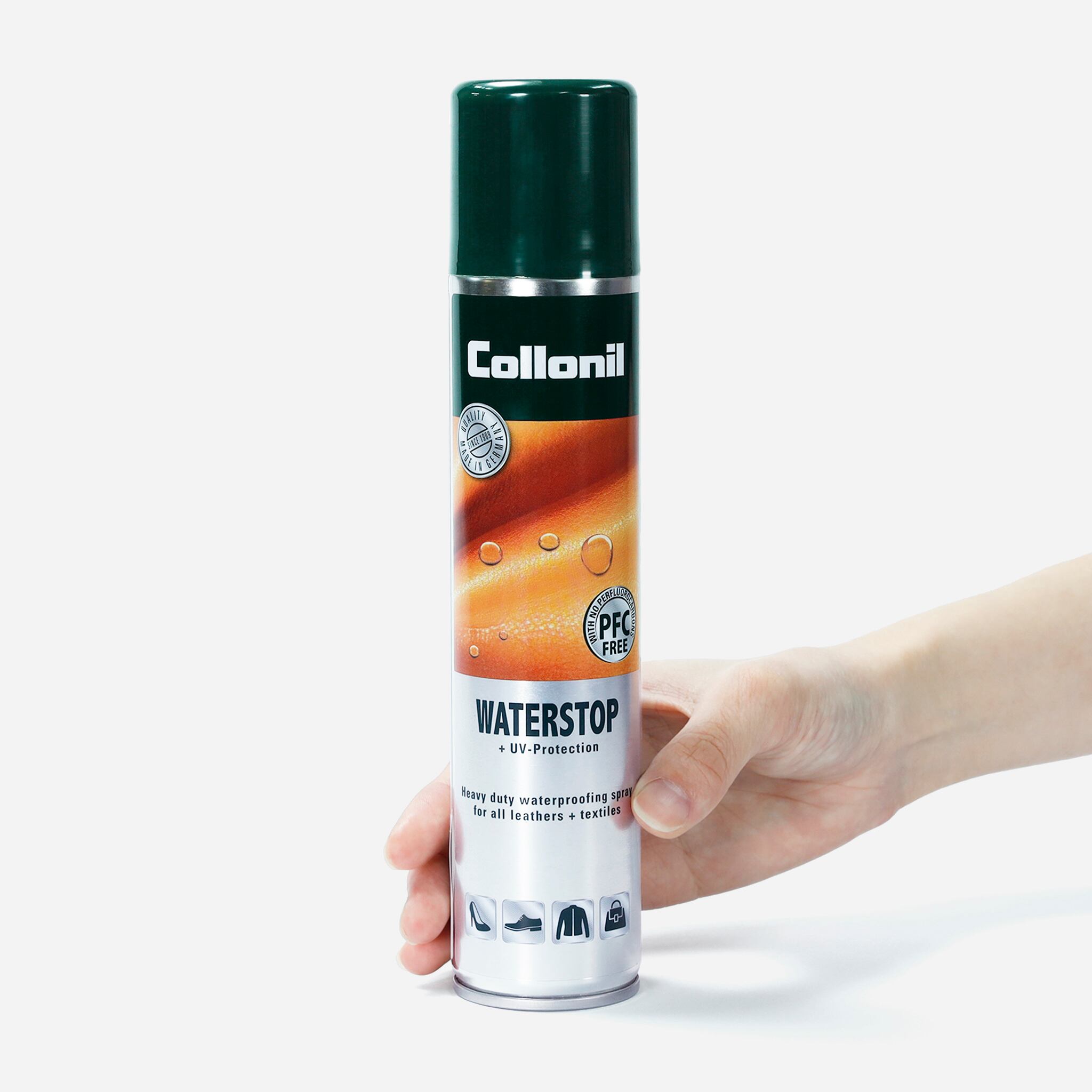 皮革の通気性・柔軟性を損なわずに防水・防汚効果を与えるスプレーです。フッ素(PFAS、PFC)を使用せず、防水ポリマーで素材を守ります。速乾性のため、デリケートな革にも安心してお使いいただけます。UVプロテクション成分配合。